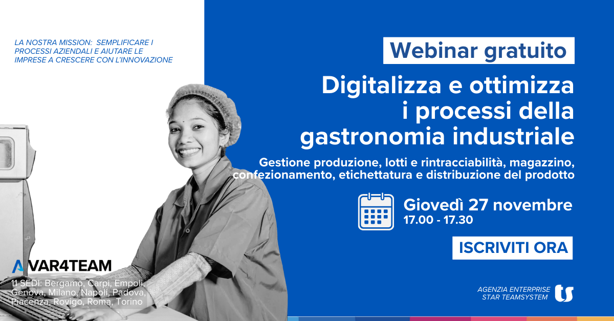 Giovedì 27 novembre Ore 17:00 – 17:30 La gastronomia industriale sta vivendo un momento di grande trasformazione: richieste crescenti da parte della GDO, normative sempre più stringenti, necessità di ridurre gli sprechi e garantire una tracciabilità impeccabile.In questo scenario, l’efficienza operativa non è più un vantaggio competitivo, ma una condizione necessaria. Questo webinar ti mostra […]